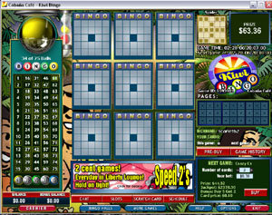 Kiwi Bingo is just as their slogan says, Great Friends, Great Fun. This jungle themed bingo venture is very well put together, one of the best sites I've played at. Once you get passed the big download (dial up be weary) set up is a breeze and you can start playing right away. Drums accompany the set up process which is pretty funny. After everything is installed you get to the cabana café, which is there snazzy way of saying lobby. From here you can navigate to the different bingo halls and other parts of the site.