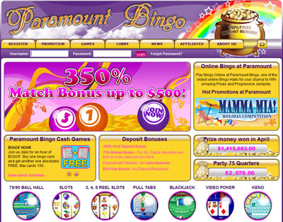 Paramount online bingo features an assortment of dime games, and then quarter games on top of those, most of the specials are dimes though. Paramount also runs lots of tournaments with large prizes.