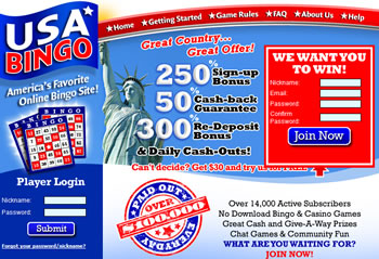 To help you get started, USA Bingo will generously reward you with a sign up bonus a little cash-back guarantee and a nice re-deposit bonus! If you can’t make up your mind they will even give you $30 to try their games for free! Other generous offers include: