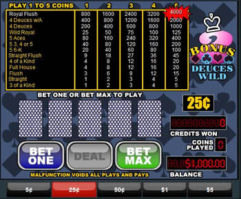 Play one to five coins in this five-card draw, free Deuces Wild poker game. Coin sizes start at $.05 and go up to $5.00, making your maximum bet $25.00 per hand.