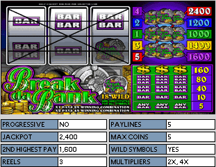 Break da Bank - 3 Spulen, 5 Bezahlungslinie. Münzgröße ordnet von Cents von 1.00 Euro bis zu 5.00 Euro an. Sie können von 1 bis 5 Linien spielen.