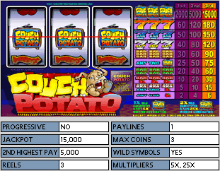 Couchpotato slot - 3 Spulen, eine Bezahlungslinie. Münzgröße ordnet von .25 Cent bis zu 5.00 Euro an. Sie können von 1 bis 3 Münzen spielen.
