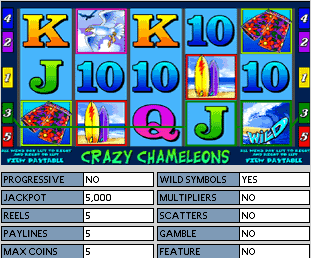 Crazy Chameleons slot - 5 Spulen, 5 bezahlungslinie. Münzgröße ordnet von .25 Cent bis zu 5.00 Euro an.