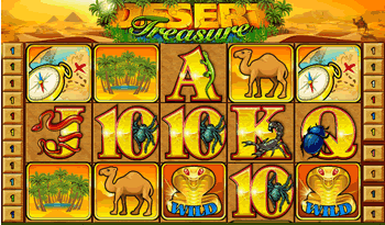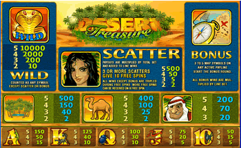 Desert Treasure Slot - 5 Walzen, 20 Gewinnlinien mit Freispielen und Bonusrunde. Münzwerte von 1 Cent bis 5,00 $.