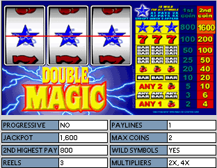 Double Magic slots - 3 Spulenl, eine Bezahlungslinie. Münzgröße ordnet von .25 Cent bis zu 5.00 Euro an. Sie können von 1 oder 2 Münzen spielen.