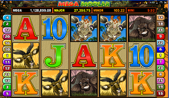 Mega Moolah ist eine 5 Spulen, 25 Bezahlungslinien, das ein afrikanisches Thema mit wilden Symbolen, Scattersymbolen und einer 4 tiered Hauptgewinn-Eigenschaft verwendet.