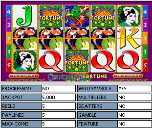 Oriental Fortune - 5 Spulen, 5 Bezahlungslinien. Münzgröße ordnet von .25 Cent bis zu 5.00Euro an.