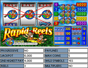 Rapid Reels - 3 Spulen, 5 Bezahlungslinien. Münzgröße ordnet von .25 Cent bis zu 5.00 Euro an. Sie können von 1 bis 5 Linien spielen,