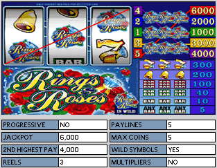 Rings and Roses -3 Spulen, 5 Bezahlungslinien. Münzgröße ordnet von .25 Cent bis zu 5.00 Euro an. Sie können von 1 bis 5 Linien spielen,