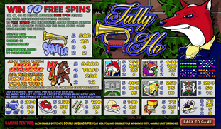 Tally Ho - 5 Spulen, 9 Bezahlungslinien mit Bonus-Runden nach. Münzgröße ordnet von 1 Cent bis zu 1.00 Euro an.