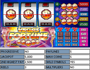 Vegas Fortune - 3 Spulen, 5 Bezahlungslinien. Münzgröße ordnet von .25 Cent bis zu 5.00 Euro an. Sie können von 1 bis 5 Linien spielen,