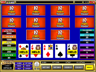 Bromista 10 manos vídeo póker: Cuando haz clic en “draw” (pedir mas cartas), la “decisión hand” será guardada y 10 manos de 5 cartas serán distribuidas, cada una por parte de una baraja diferentes.