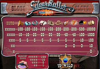 Silver Bullet - 5 rulli, 9 linee di vincita con gioco omaggio. Il taglio dei gettoni va da 1 centesimo fino a 5 $.
