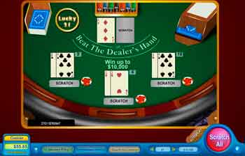 An online instant game of Blackjack, Lucky 21 lets you build a hand and instantly win the chance at jackpots worth up to $100,000! Get three chances to win each game as you try to beat the dealer in this classic game of 21. If you can beat the dealer, you’ll win the mystery amount beneath the winning hand.
