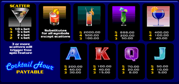Cocktail Hour - 5 reel, 9 paylines with free games.