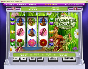 Enchanted Fortunes reels are full of cute little gnomes and pixies for your liking. The game sounds like you're in the middle of a forest and where else are you going to run across little people standing by mushrooms the size of them willing to pay you money! Enchanted fortune is a 3 reel slot machine with 5 pay lines. It's possible to bet up to 3 coins per line, coins range in value from a dollar on down.