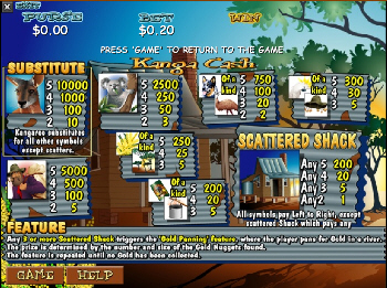 Kanga Cash is a 5 reel, 20 payline game with a bonus feature that has you panning for gold nuggets while playing at Lasseters casinos.