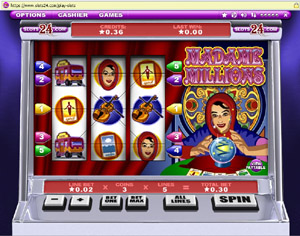 Does Madame see millions in your future? Take a look into her crystal ball playing this engrossing gypsy-esque 3 reel slot. 3 coins and 5 paylines later you could end up with a boat load of cash. Betting is limited to $15 max. Coins are valued from one cent to one dollar, with 5 values in between. Madame Millions uses 15 different symbols all on 3 lines.