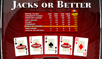 Jacks or Better is usually the game standard that other variations of video poker are based on. Payout rates are figured beginning with pairs of Jacks or better, two pair, three of a kind, straight, flush, full house, four of a kind, straight flush, and Royal Flush.