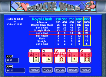 Deuces Wild is my favorite version of video poker. It's played with one deck of 52 cards and all deuces are wild. Because the wild cards lower the odds on getting the higher ranking combinations, the pay table is adjusted and more combinations are added.