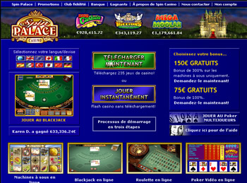 Lancé en 2002,Spin Palace est devenu l’un des plus populaires casinos en ligne et a remporté plusieurs prix réputés, parmi lesquels le prix « Meilleur Nouveau Casino » de Casinomeister en 2002 qui a félicité le site pour « son respect du jeu, son service d’assistance et ses offres spéciales ». Le site propose un vaste choix de jeux (plus de 230 au total) dont plusieurs versions de machines à sous, Vidéo Poker, Blackjack, Roulette, Craps, Baccarat et plusieurs Jackpots progressifs (dépassant souvent 1 000 000 euros !) avec une moyenne de paiement pour tous les jeux de 97.62%. Les joueurs peuvent jouer gratuitement avec un compte « invité » avant d’ouvrir un compte « réel » sur lequel ils peuvent recevoir jusqu’à 150€ de bonus gratuit.  Les joueurs peuvent parier dans 4 devises différentes ($, £, Euro, CA$) et le site est disponible en 7 langues (anglais, espagnol, italien, turque, japonais, allemand et français).