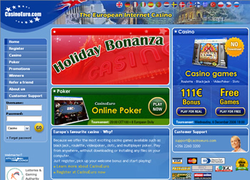 Det finnes for tiden en velkomstbonus tilgjengelig for nye spillere opptil 111 Euro, som er 50% opptil et innskudd på 222 Euro. Spillere kan i tillegg bli VIP CasinoEuro medlem og motta opptil en 60 Euro bonus per måned ved å være en lojal spiller. Verv-en-Venn bonuser er også tilbudt på siden.